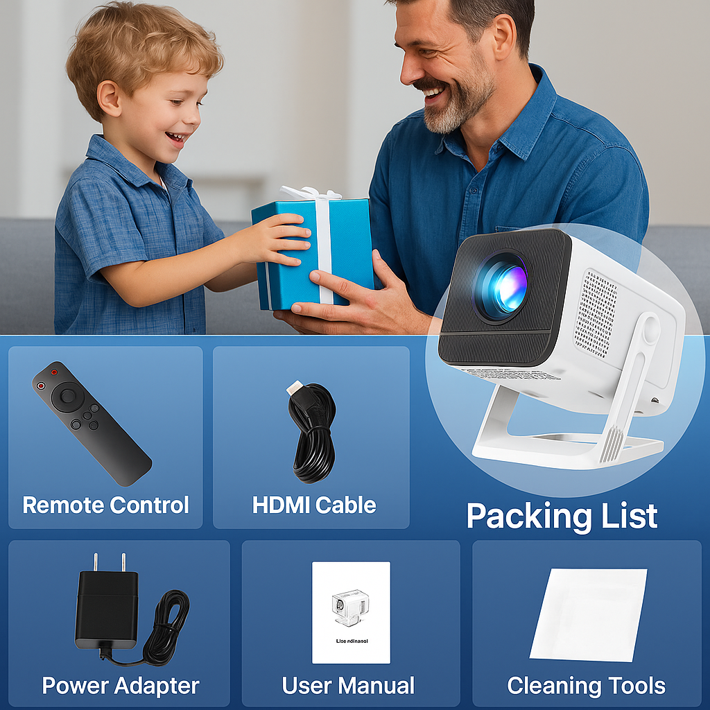 From the remote and HDMI cable to the power adapter, manual, and cleaning tools, it’s all included.